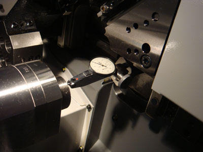 10、背面鉆孔刀架與背軸同心度: 把千分表裝在專用的檢具上,觸頭接觸刀架孔內(nèi)的檢棒,旋轉(zhuǎn)表頭,觀察千分表指針數(shù)據(jù). 加工影響:刀具(鉆頭)壽命,偏孔,擴(kuò)孔